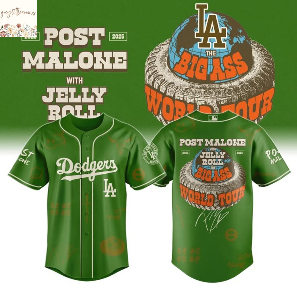 The standout feature of this jersey is its vibrant green base color, which offers a bold and eye-catching alternative to traditional Dodgers gear. The front of the jersey features the classic white “Dodgers” script logo prominently displayed across the chest, with the “LA” logo on the lower left side. The contrast between the deep green and crisp white lettering provides a striking visual effect, ensuring wearers stand out in any crowd. On the right sleeve, you’ll find “POST MALONE” printed in a matching white font, aligning perfectly with the tour branding.
