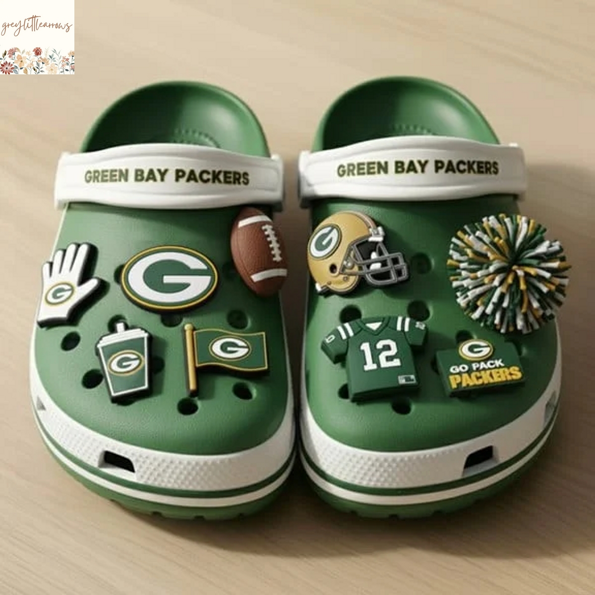 What truly distinguishes this product is its vibrant Green Bay Packers theme. The clogs are steeped in the team’s unmistakable colors, featuring a dominant, rich forest green that blankets the upper, complemented by lively sunny gold accents that highlight the details, such as the iconic pivoting heel strap. This strap, a functional and adaptable element, can be worn forward for a secure fit during more active moments or pushed back to convert the Crocs into an easy-on, easy-off slide. Prominently displayed on the upper, often on the lateral side, is the legendary Green Bay Packers “G” logo, rendered with precision and clarity, leaving no doubt about your team affiliation. This emblem is a symbol of decades of tradition and excellence, instantly recognizable to fellow fans and serving as a conversation starter. Adding an extra layer of personalization and fun, these Crocs come complete with a curated set of Jibbitz™ charms. These aren’t just any charms; they are specifically designed with Packers motifs, potentially including the classic “G” logo, a miniature football, or other team-specific graphics. These charms effortlessly snap into the ventilation ports on the upper, allowing users to customize their footwear and further express their individual style and fandom. The ability to swap out these charms means the Crocs can evolve with your mood or display different aspects of your Packers pride.