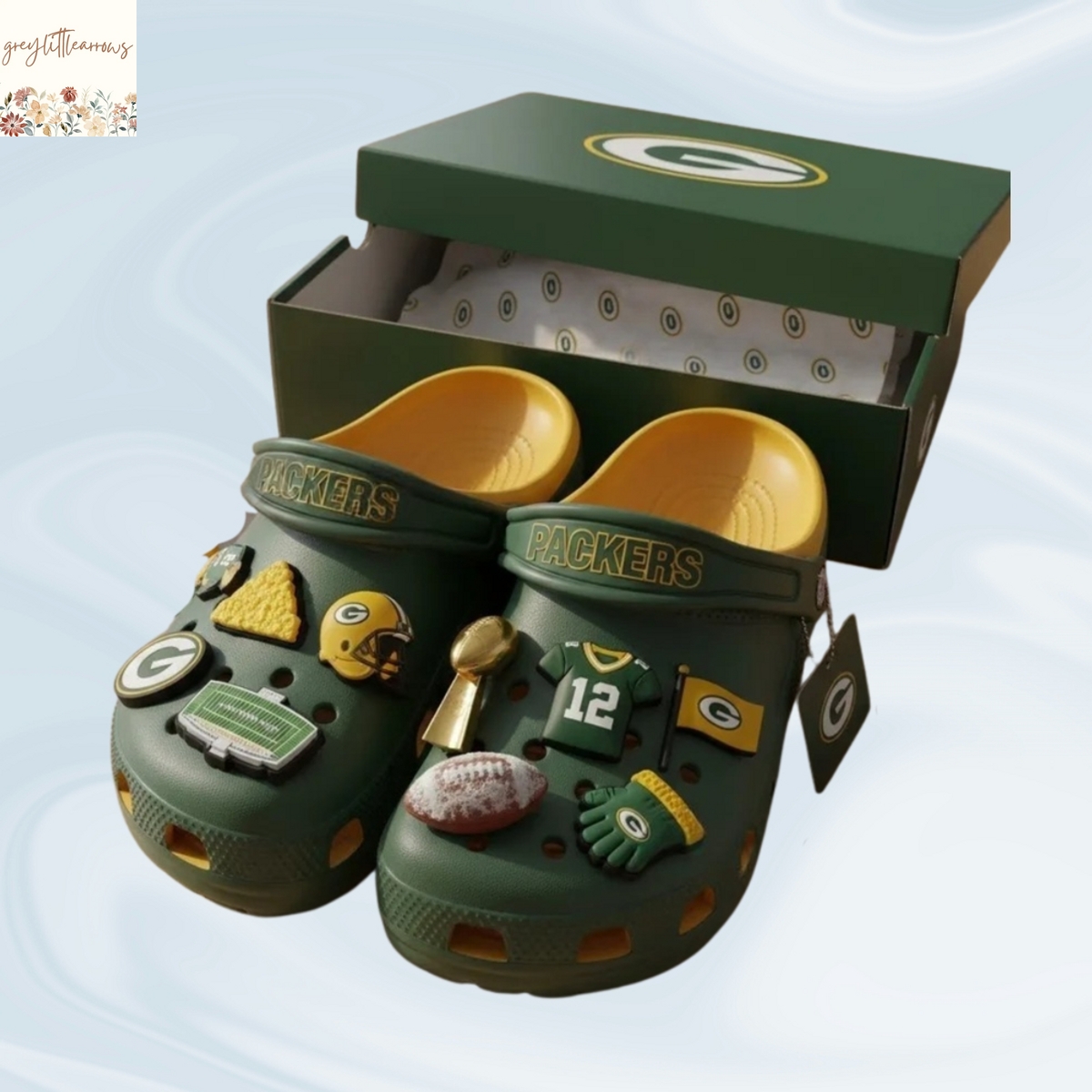 The Green Bay Packers identity is unmistakably integrated into every aspect of these Crocs. The base color is typically a vibrant Packers green, or sometimes a complementary gold or black, providing an immediate visual cue of allegiance. Beyond the dominant color, specific team branding elements are subtly incorporated into the Clog itself, perhaps with a molded “G” logo on the side or the team name embossed on the heel strap. However, the true highlight and differentiator are the accompanying charms. Each pair arrives with a curated collection of Green Bay Packers-themed Jibbitz™, meticulously designed to represent various iconic symbols of the franchise. Fans can expect to find a classic “G” logo, a miniature Packers helmet, perhaps a football, a cheese wedge, the team name in bold lettering, or even a representation of Lambeau Field. These durable PVC charms are easily pushed into the ventilation holes, allowing users to arrange them in any order they desire, creating a truly custom display of their fandom. This interchangeable nature means fans can swap out charms, collect new ones, or even mix them with other interests, further enhancing the product’s appeal and longevity.