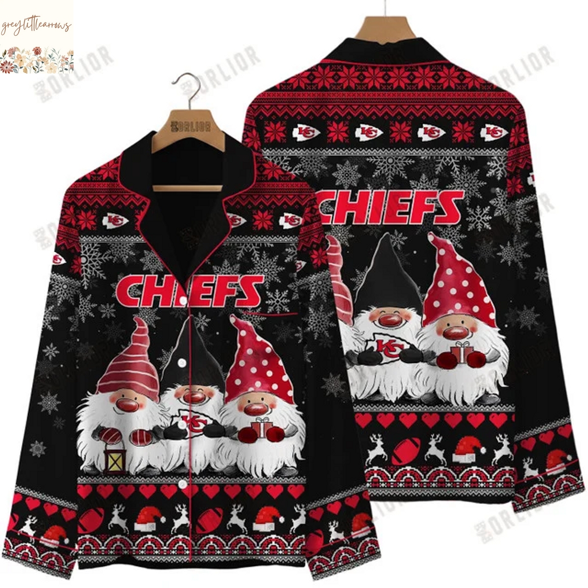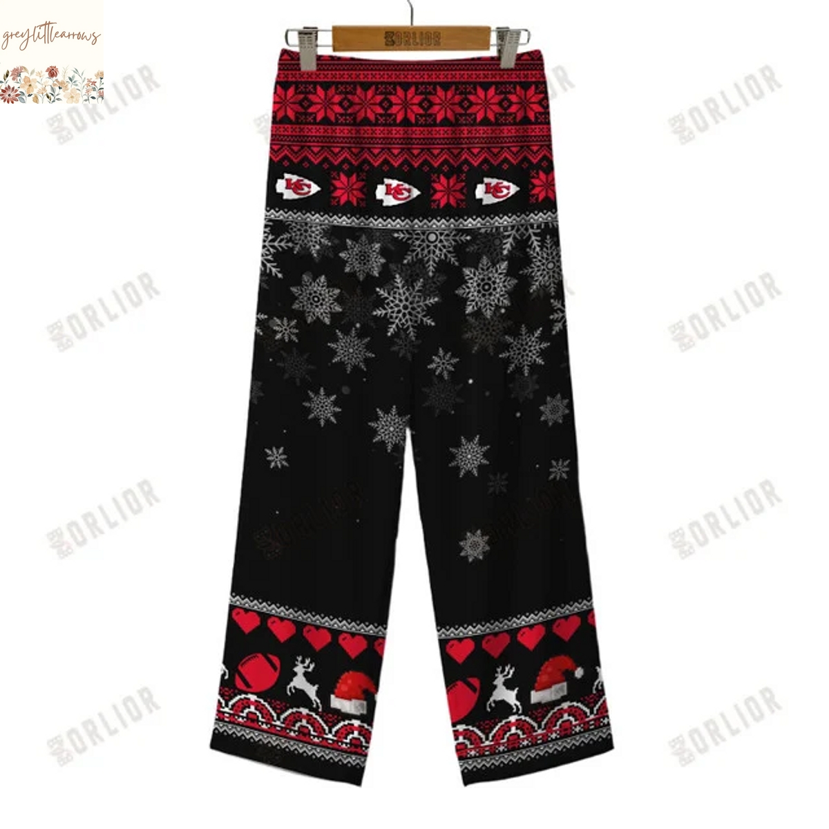 Visually, the set is a triumph of thoughtful design, seamlessly integrating Chiefs branding with distinct holiday elements. The long-sleeved top proudly displays a generously sized, iconic Kansas City Chiefs arrowhead logo centrally positioned on the chest, rendered in the team’s unmistakable primary red and gold. This focal point is elegantly bordered by subtle, tasteful holiday motifs, such as delicately embroidered snowflakes or a festive pattern of miniature footballs nestled among sprigs of holly, all subtly incorporated within the Chiefs’ official color palette. The full-length pants feature an elasticized waistband for a comfortable, non-restrictive fit, and are adorned with an all-over repeating pattern that masterfully combines smaller Chiefs logos – perhaps tiny helmets wearing Santa hats or miniature team flags – with charming holiday symbols like candy canes, twinkling stars, or winter trees. This cohesive design ensures that every inch of the pajama set radiates both team spirit and seasonal joy, making it instantly recognizable and delightfully festive.