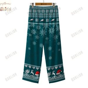 The aesthetic design of the set is a sophisticated fusion of traditional Eagles iconography and playful holiday motifs. The dominant color palette features the iconic Eagles midnight green, accented with crisp white, subtle black, and festive silver, creating a look that is unmistakably loyal while resonating with seasonal charm. The long-sleeved top, typically a relaxed-fit button-down or a comfortable crew-neck, showcases a repeating pattern of stylized snowflakes subtly integrated with miniature Eagles logos and helmets, alongside small, festive elements like holly sprigs or tiny Santa hats adorning the bird’s head. A larger, central graphic on the back or chest often features a classic Eagles wordmark or primary logo playfully outlined with twinkling lights or nestled within a snow globe design. The matching full-length pajama pants feature a similar all-over pattern, equipped with a comfortable elastic waistband and an adjustable drawstring for a customizable, non-restrictive fit. Pockets are often included for added convenience, perfect for holding a phone or small essentials while lounging. The cuffs on both the sleeves and pant legs are typically ribbed or cuffed, ensuring they stay in place and provide a snug, draft-free feel.