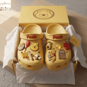 For potential customers, the advantages of owning Pooh Crocs With Charms are multifaceted. Beyond the undeniable comfort and the practical benefits of easy cleaning, quick drying, and long-lasting durability, these Crocs offer a unique blend of style and emotional connection. They fulfill the need for footwear that is not only functional but also sparks joy and showcases personality. Parents looking for durable, easy-to-maintain shoes that children will adore will find these a perfect fit, as the whimsical design encourages wear and the Croslite™ material withstands rough play. Adults seeking a touch of whimsy in their everyday life, or a comfortable option that reflects their love for classic characters, will find these Crocs irresistible. The ability to swap out or add more Jibbitz™ charms means the look can evolve, keeping the footwear fresh and engaging over time, meeting the need for evolving personal style. Whether for lounging at home, a casual stroll in the park, a quick run to the store, or simply as a conversation starter, these Pooh Crocs deliver on their promise of combining iconic comfort with heartwarming character appeal, making them a truly special addition to any footwear collection.